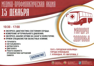 Уважаемые жители Кувандыкского городского округа! В рамках реализации Плана министерства здравоохранения Оренбургской области 15 декабря 2018 года на территории Кувандыкского городского округа пройдет медико-профилактическая акция «Маршрут здоровья».